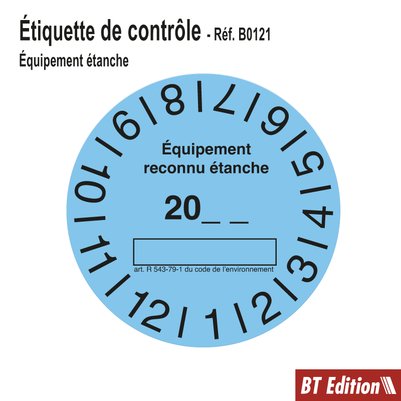 Etiquettes de Contrôle d'Etanchéité Bleues, équipement reconnu étanche, conformes à l'arrêté du 29 février 2016.